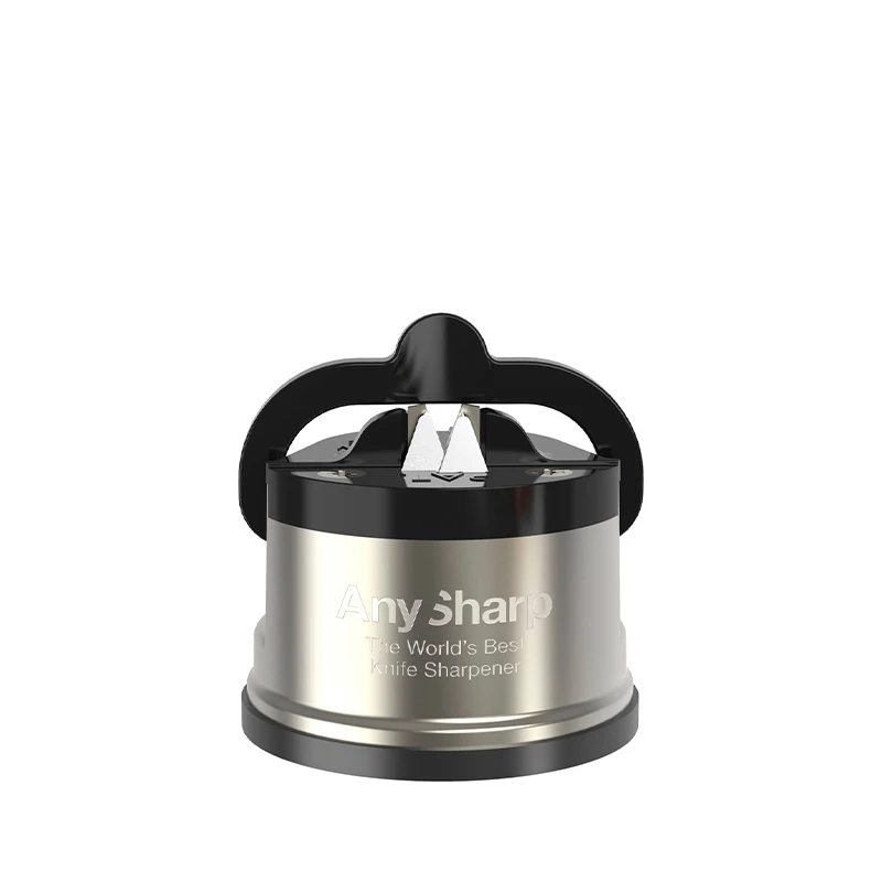 En smart, kompakt og super funktionel knivsliber i særklasse. Den geniale sugekop som sættes fast på køkkenbordet sikrer, at du let med en hånd kan slibe dine knive. Du kan slibe alle dine knive – selv brødknive! Anysharp Pro knivsliberen har den mest optimale vinkel på 20 grader, der sikrer den bedst mulige slibning af dine køkkenknive. Placér blot kniven ovenpå de to skarpe slibeblade af tungsten, og træk herefter kniven let henover 3-4 gange. Anysharp Pro gør det ualmindeligt nemt for dig at slibe og vedligeholde alle dine køkkenknive. 1-2-3 slib!