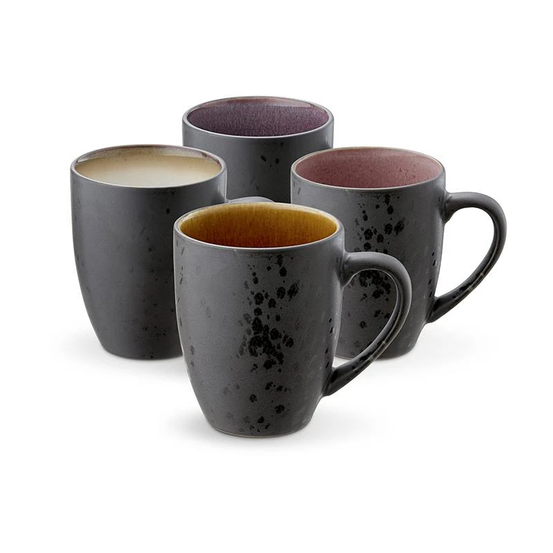 Bitz krus med hank 30 cl i stentøj. Krusene er matsort stentøjudenpå og henholdsvis amber, lilla, lyserød og cremefarvet indeni. Stentøjet er fremstillet i en smuk reaktiv glasur der giver en ekstra glød. Glasuren gør også at hvert produkt er uikt. Tåler opvaskemaskine, mikroovn og ovn op til 220 grader