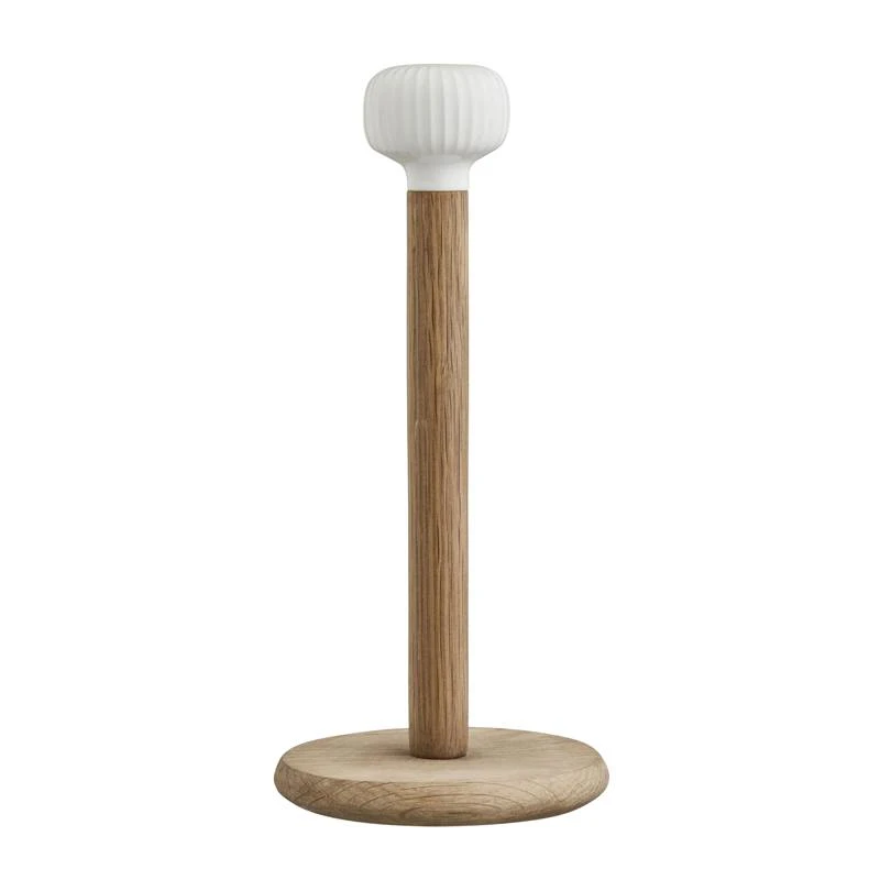 Kähler Hammershøi køkkenrulleholder i hvid keramik og olieret egetræ. Elegant køkkenrulleholder der giver et smukt strejf i enten køkkenet, på middagsbordet eller hvor i huset holderen placeres. Foden har et magnetsystem der holder de to trædele sammen og er med til at gøre det nemt at udskifte køkkenrullen. H:31,5 cm, Ø:14 cm.