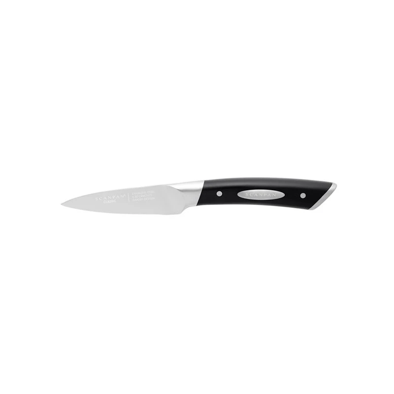 Urtekniv 9 cm. Perfekt til håndtering af små snitte og hakkeopgaver. Scanpan Classic knivserien er fuldsmedet knive i høj kvalitet. Konisk slevet knivsæg og forbedret slibeteknik sikrer kniven optimal skarphed og levetid. Gør den også nem at slibe/ vedligeholde. Danske design Perfekt vægtfordeling og balance med ergonomisk håndtag der giver et godt greb. Scanpan yder 5 års garanti på dette produkt.