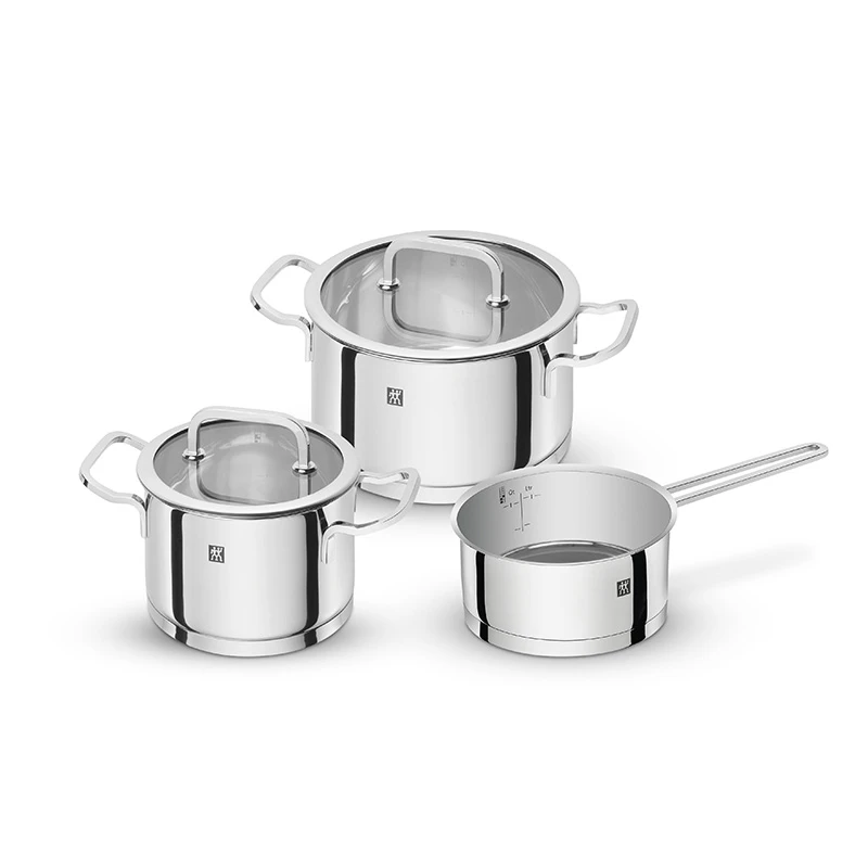 Zwilling Moment grydesæt består af kasserolle 1,5 ltr, gryde 2,0 ltr og 3,8 ltr samt 2 glaslåg.